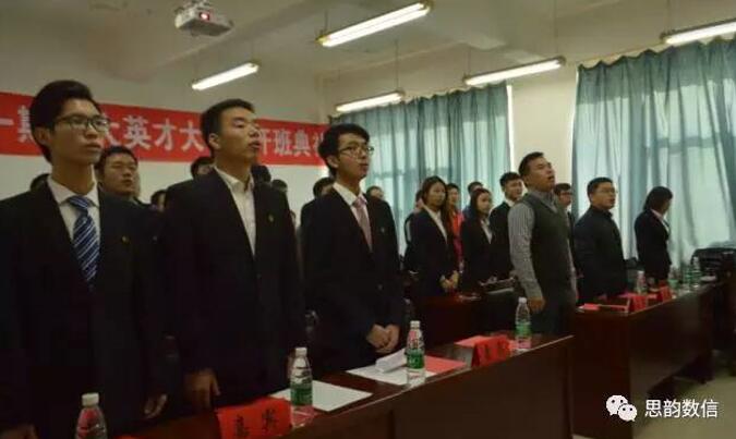 仪式进行到高潮,由徐武俊老师授数信第一届大骨班班旗给班级负责人张曼利。授旗结束,学生会主席谢祺介绍了大骨班人员,上课时间及课程安排等,并强调了本届大骨班纪律的严格性。
